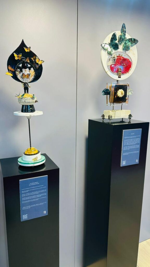 La muestra reúne pinturas, esculturas, collages, fotografías y objetos reciclados elaborados con metales, resinas y cerámicas, donde la artista combina técnicas clásicas y contemporáneas.