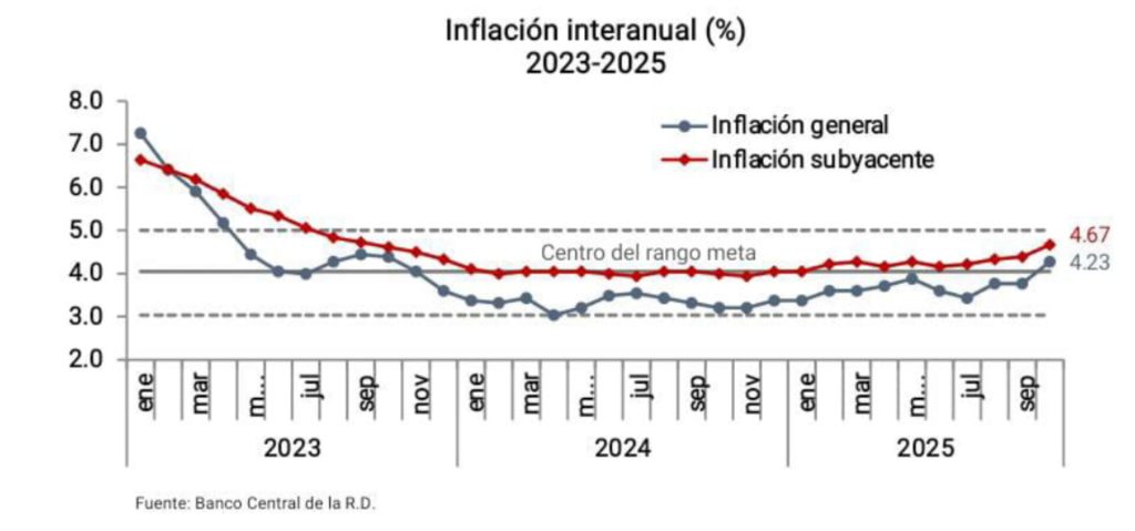 Santo Domingo. República Dominicana. El Banco Central de la República Dominicana informa que el índice de precios al consumidor (IPC) registró una variación mensual de 0.55 % en octubre 2025, situando la inflación interanual medida de octubre 2024 a octubre 2025 en 4.23 %.