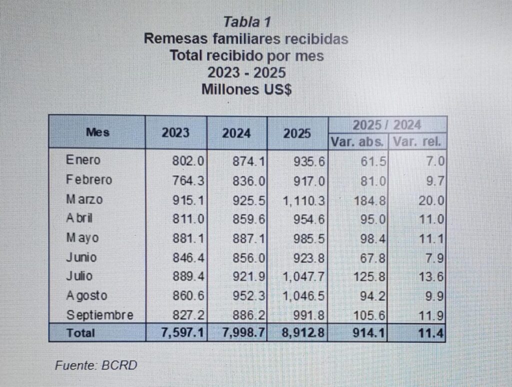 Santo Domingo, RD Domingo 12 De Octubre 2025.- El Banco Central de la República Dominicana (BCRD) informa que, entre enero y septiembre de 2025, las remesas recibidas alcanzaron la cifra de US$8,912.8 millones, aumentando US$914.1 millones (11.4 %) en comparación con el mismo período del año anterior. Particularmente, en el mes de septiembre se recibieron US$991.8 millones, un incremento de US$105.6 (11.9 %) respecto a septiembre de 2024. Cabe destacar que, estos recursos suministrados por la diáspora dominicana en el exterior tienen un efecto multiplicador sobre el consumo, la inversión y el financiamiento de los sectores más vulnerables del país.
