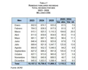 Santo Domingo, RD Jueves 08 De Enero 2026. El Banco Central de la República Dominicana (BCRD) informa que, durante el año 2025, se recibieron US$11,866.3 millones por concepto de remesas, lo que representa un aumento de US$1,110.3 millones (10.3 %) en comparación con el año 2024. Particularmente, en el mes de diciembre se recibieron US$1,098.4 millones, un incremento de US$94.9 millones (9.5 %) respecto a diciembre de 2024, y un incremento de US$208.9 millones (23.5 %) con respecto al mes de noviembre de 2025.