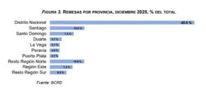 Respecto a la distribución de las remesas recibidas por provincias, el BCRD señala que el Distrito Nacional recibió una proporción del 45.8 % durante diciembre, seguido por las provincias de Santiago y Santo Domingo, con un 10.9 % y 7.5 %, respectivamente. Esto indica aproximadamente dos terceras partes de las remesas (64.2 %) se reciben en las zonas metropolitanas del país.