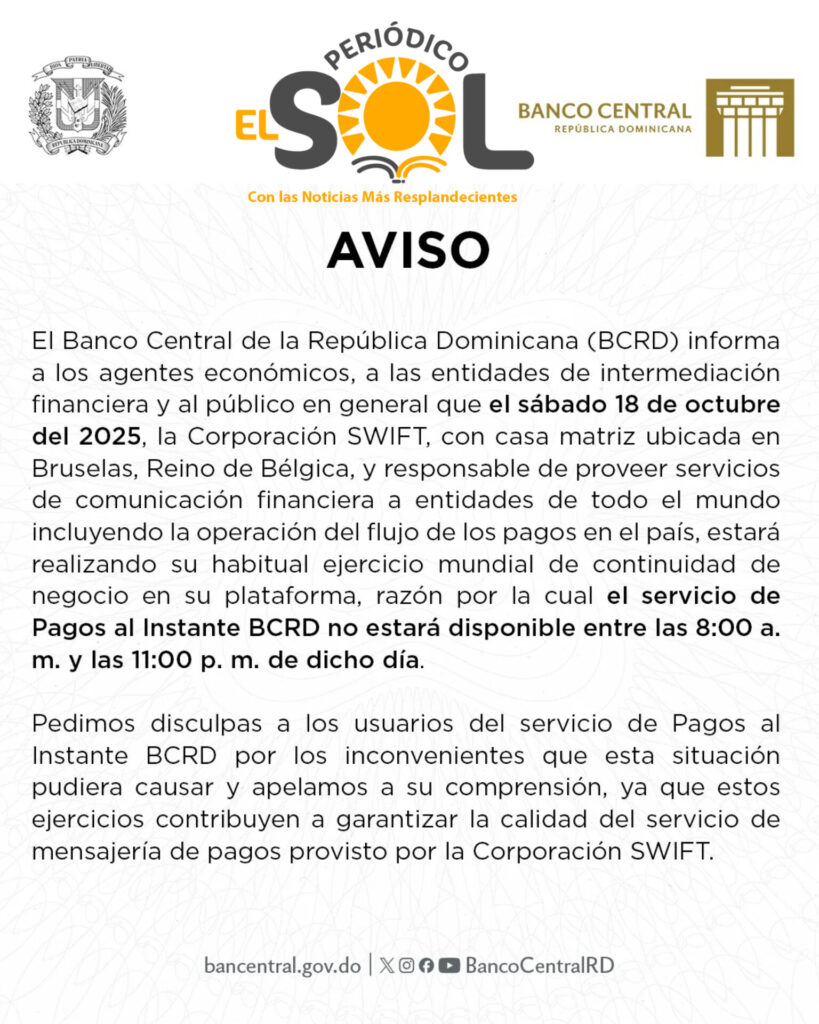 El Banco Central de la República Dominicana (BCRD) informó, a través de un comunicado oficial, que mañana sábado 18 de octubre de 2025 la Corporación SWIFT, cuya oficina matriz se encuentra en Bruselas, Reino de Bélgica, y que es responsable de proveer servicios de comunicación financiera a entidades de todo el mundo, incluyendo la operación del flujo de pagos en el país, realizará su ejercicio mundial habitual de continuidad de negocios en su plataforma.
