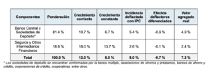 De igual forma, indica que “en el marco del SCN 2008, también se incorpora en la producción del sector financiero las comisiones implícitas, denominadas servicios de intermediación financiera medidos indirectamente (SIFMI), las cuales se generan al imputar una comisión por servicios indirectos a todos los préstamos y depósitos ofrecidos por una institución financiera”.