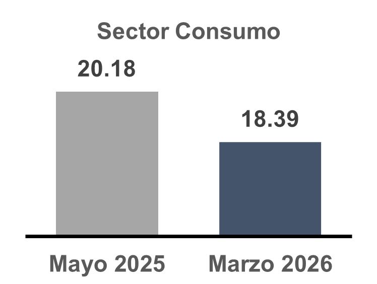 De igual manera, el comportamiento por sectores económicos de la tasa de interés revela disminuciones importantes en los préstamos otorgados por la banca múltiple, abarcando tanto los sectores productivos como el financiamiento al consumo. Puntualmente, la tasa de interés para el financiamiento de los sectores productivos pasó de 14.35 % en mayo de 2025 a 12.16 % en marzo de 2026. En particular, esta reducción se refleja en la tasa de interés de sectores económicos con alto impacto sobre la actividad económica. De manera concreta, en marzo de 2026 la tasa activa para el comercio al por mayor y al detalle exhibe una disminución de 274 puntos básicos en comparación con el nivel registrado en mayo 2025, al pasar de 14.84 % a 12.10 %. En el caso del sector agropecuario, la tasa activa fue menor en 263 puntos básicos al pasar de 15.94 % en mayo de 2025 a 13.31 % en marzo de 2026. Al mismo tiempo, la tasa activa del sector de manufactura registró una disminución de 190 puntos básicos, pasando de 13.15 % en mayo 2025 a 11.25 % en marzo 2026.