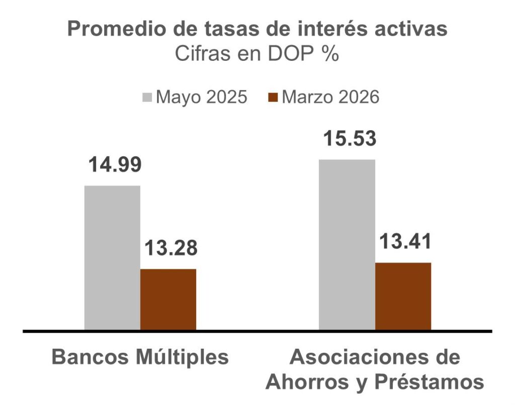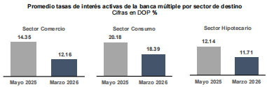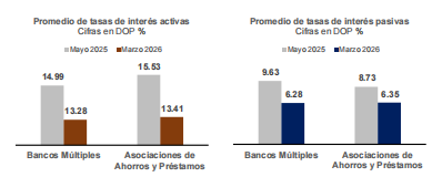 Esta reducción en la tasa de interés pasiva ha contribuido a una disminución significativa de la tasa de interés activa del sistema financiero, facilitando condiciones monetarias más favorables para el crédito. En ese tenor, el promedio de la tasa de interés activa de la banca múltiple pasó de 14.99 % en mayo de 2025 a 13.28 % en marzo de 2026, para una disminución de 171 puntos básicos. Un comportamiento similar se observa en las asociaciones de ahorros y préstamos, donde dicha tasa se ajustó a la baja en 211 puntos básicos.