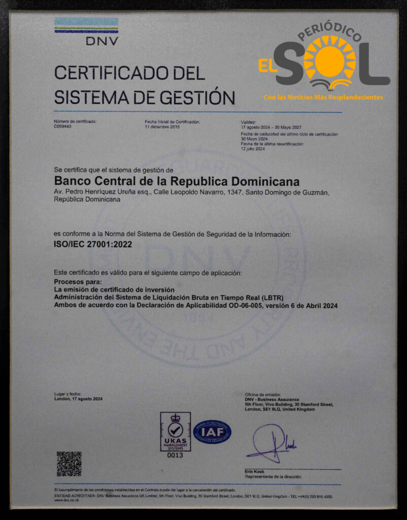 Montserrat Aguilar, representante de la sociedad internacional de homologación con sede en Noruega, Der Norske Veritas (DNV), señaló que “esta certificación valida que el Banco Central cumple con los lineamientos establecidos en la norma ISO/IEC 27001:2022, lo cual evidencia el esfuerzo continuo por mantener a la República Dominicana en los mejores parámetros de autodefensa ante los riesgos y contingencias que depara el manejo de la información”.
