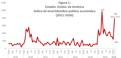 El aumento en la incertidumbre se debe, en gran medida, a tres factores: 1) La intensificación de los riesgos geopolíticos en lugares como Irán, Venezuela y Groenlandia; 2) el impacto en la política  comercial de EE. UU. de la decisión de la Suprema Corte de Justicia de declarar ilegales los aranceles impuestos por órdenes ejecutivas; y 3) Las renovadas presiones de la Administración Trump sobre la Reserva Federal (FED) en un momento de importantes cambios en su plana gerencial, lo que causa preocupación sobre el futuro de la política monetaria estadounidense. Veamos.