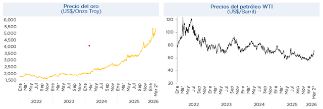Desde comienzos de 2026, los riesgos geopolíticos han aumentado significativamente. La escalada del conflicto entre Estados Unidos, Israel e Irán ha llevado a ataques directos en Teherán y a represalias iraníes contra Israel y bases estadounidenses en distintos países entre los que se incluyen los Emiratos Árabes Unidos, Catar, Bahréin, Arabia Saudita y Kuwait, entre otros. Esta situación, sumada a la inestabilidad en Venezuela y a tensiones en regiones no tradicionales como Groenlandia, ha afectado los mercados energéticos, el comercio marítimo y la percepción de riesgo global, reduciendo las expectativas de crecimiento mundial.