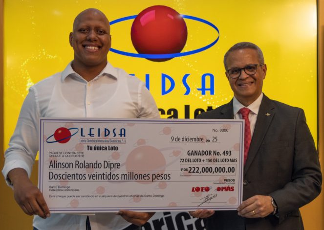 La Lotería Electrónica Internacional Dominicana, S.A (LEIDSA), informó que entregó el cheque de 222 millones al joven Alinson Rolando Dipré, ganador del Loto y el Más en el sorteo correspondiente al pasado sábado 15 de noviembre.