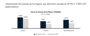 Al mismo tiempo, las tasas de interés activas de la banca múltiple se situaron en 13.26%, durante el mes de diciembre de 2025, por debajo del 15.05% observado en diciembre de 2025, para una disminución interanual de 179 puntos básicos. Se destacan las disminuciones significativas de las tasas de interés para préstamos a sectores productivos, que redujeron de 14.07% a 12.86% (160 puntos básicos) en el período diciembre 2024-2025, así como las tasas de interés para