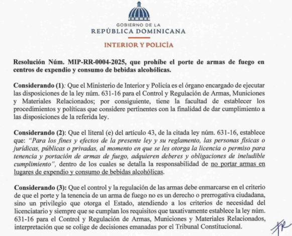SANTO DOMINGO, Viernes 01 De Agosto 2025.- Con el fin de fortalecer la seguridad ciudadana y prevenir hechos de violencia, el Ministerio de Interior y Policía emitió la Resolución MIP-RR-0004-2025, que prohíbe el porte de armas de fuego en lugares de expendio de bebidas alcohólicas, sin importar la categoría de licencia.