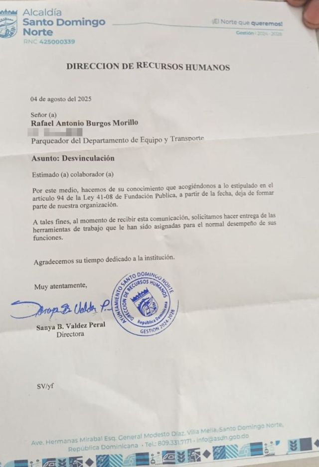 EL NUEVO DIARIO, SANTO DOMINGO Miercoles 06 De Agosto 2025.- Un exempleado del Ayuntamiento Santo Domingo Norte (SDN) denunció que, por intercambiar un saludo con el senador del Distrito Nacional, Omar Fernández, fue desvinculado de dicha institución.