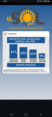 Santo Domingo Martes 05 De Agosto 2025. – El dirigente político Jean Luis Rodríguez lidera las preferencias para ocupar la Secretaría General del Partido Revolucionario Moderno (PRM), según una encuesta nacional realizada por Grupo INVESCA, en la que obtuvo un 47% del respaldo entre la militancia consultada.