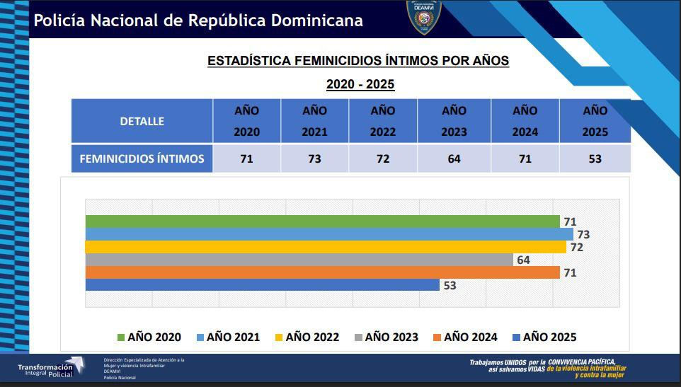 Datos y prevención. Según la estadística que acompaña esta comunicación (imagen de apoyo), los registros de feminicidios íntimos muestran la siguiente evolución: 2020: 71 | 2021: 73 | 2022: 72 | 2023: 64 | 2024: 71 | 2025: 53. Esto representa una reducción de 25.4% entre 2024 (71) y 2025 (53).
